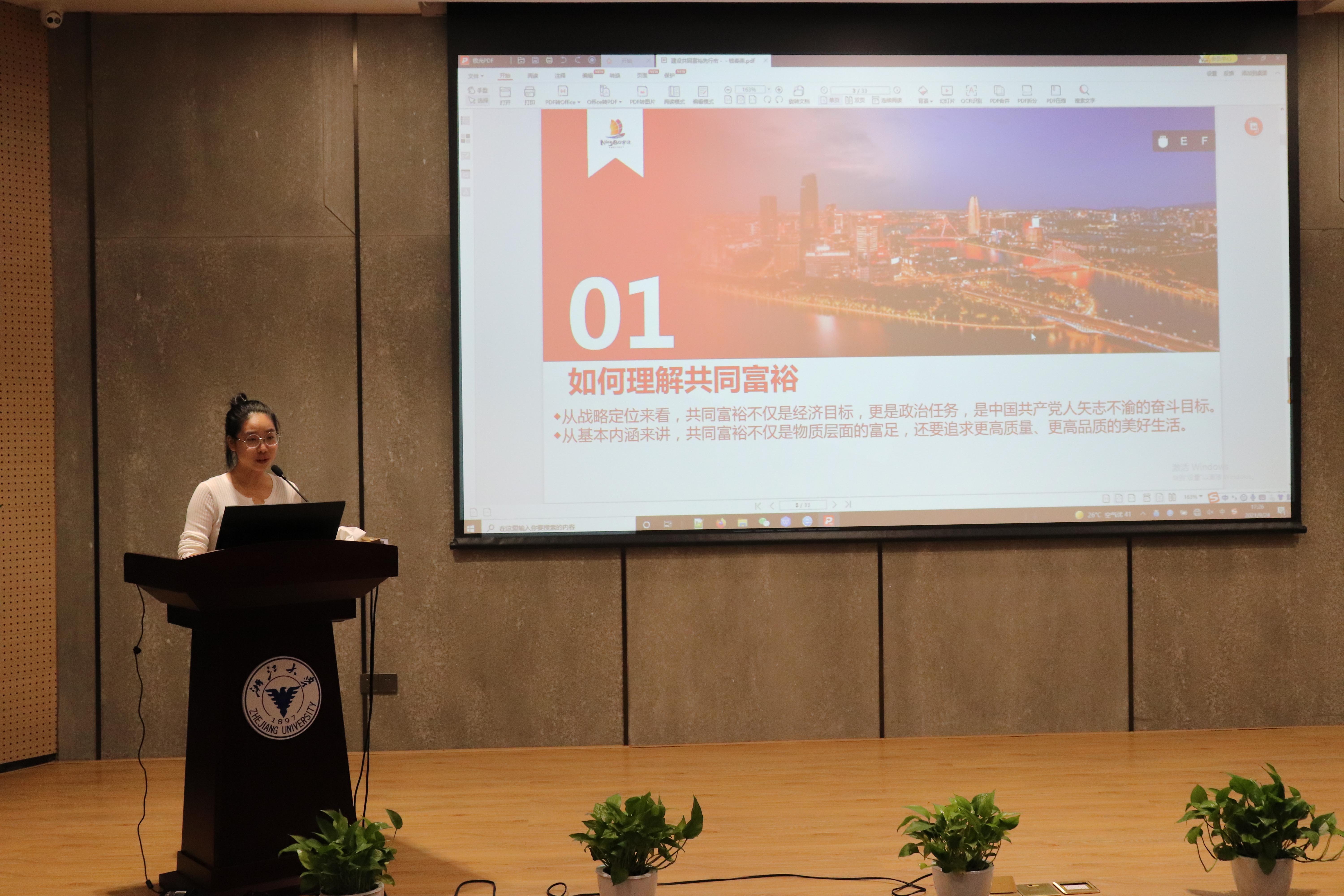 沈老师从如何理解共同富裕、我市工作推进和部分案例典型三个方面开展宣讲。她提到,共同富裕不仅是经济目标,更是政治任务,是共产党人矢志不渝的奋斗目标,共同富裕是物质富足和美好生活的结合,习近平主席任总书记之后更是大力推进脱贫攻坚政策,努力实现共同富裕。她指出,2020年总书记亲临浙江视察,第一站就来到宁波,在后面的会议中也多次提及宁波,市政府也高度重视共同富裕工作,制定了完善计划。最后她以象山、奉化等典型区域为例,详细介绍了宁波市共同富裕工作具体情况。