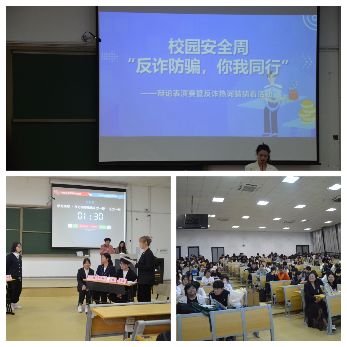 4月12日晚,“反诈防骗,你我同行”辩论表演赛暨反诈热词猜猜看活动在SB104进行,保卫处李珍老师和永利yl23411官网沈樱枝老师出席。永利yl23411官网辩论队围绕“校园安全主要依靠公司管理/员工自律”唇枪舌剑、针锋相对,为200余名现场观众带来了一场精彩的言语盛宴。反诈热词猜猜看活动以小游戏的方式,让同学们了解常见诈骗手段,提高意识警惕,现场欢声笑语不断。最后,公司员工会主席吴美瑶同学开展安全主题宣讲,进一步加强反诈防骗教育。