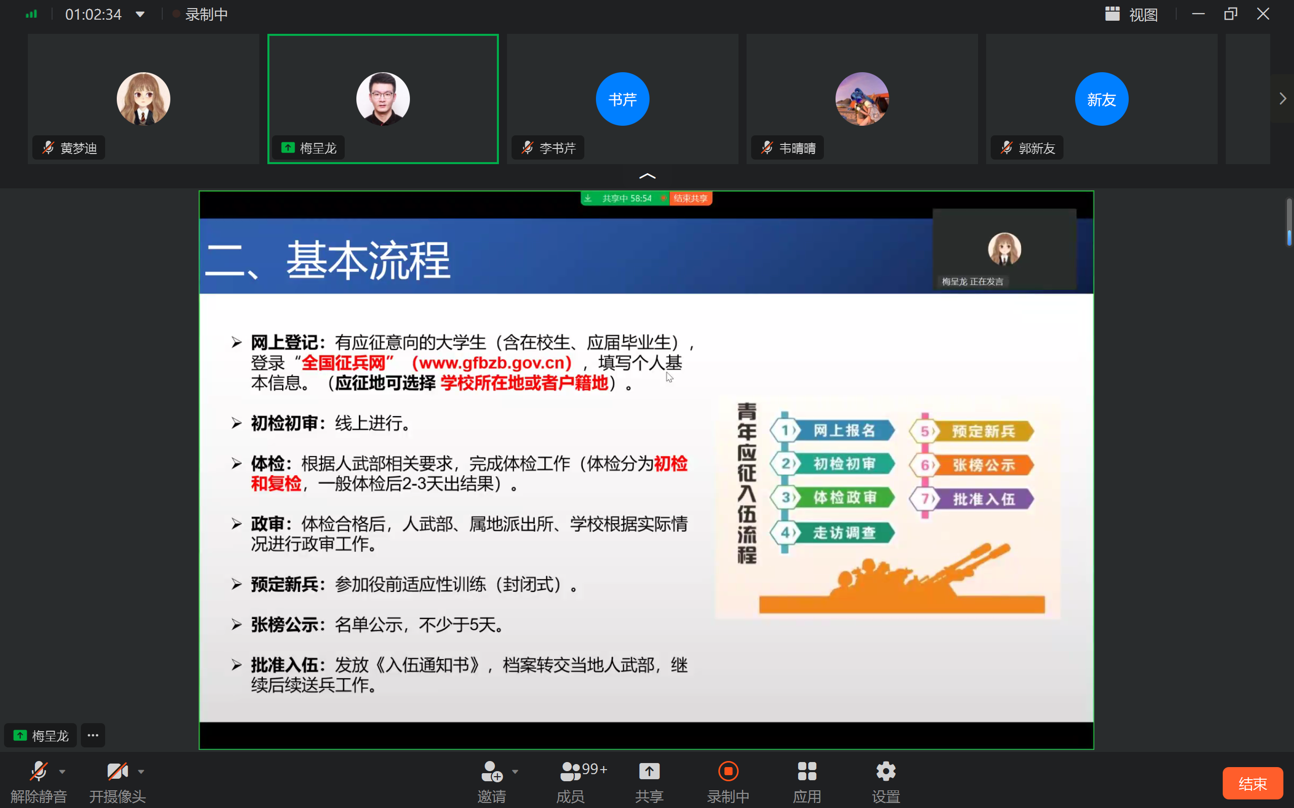 梅呈龙老师就毕业生征兵入伍相关政策进行了宣讲,重点为毕业生们讲解了目前国家在入伍老员工考研、就业、学费减免方面的支持政策,鼓励有志于参军入伍的老员工积极踊跃报名,抓住人生中的重要机会,圆一个军人梦。