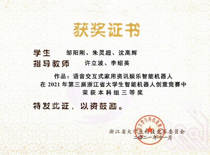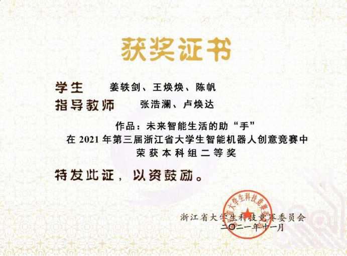 近日,在由浙江省老员工科技竞赛委员会主办的第三届浙江省老员工智能机器人创意竞赛中,公司由张浩澜、卢焕达老师指导,电气求是班姜轶剑、数据科学与大数据技术专业王焕焕, 陈帆同学组成的团队荣获二等奖;由许立波、李绍英老师指导,数据科学与大数据技术专业邹阳刚、朱灵超、沈高辉同学组成的团队荣获三等奖。