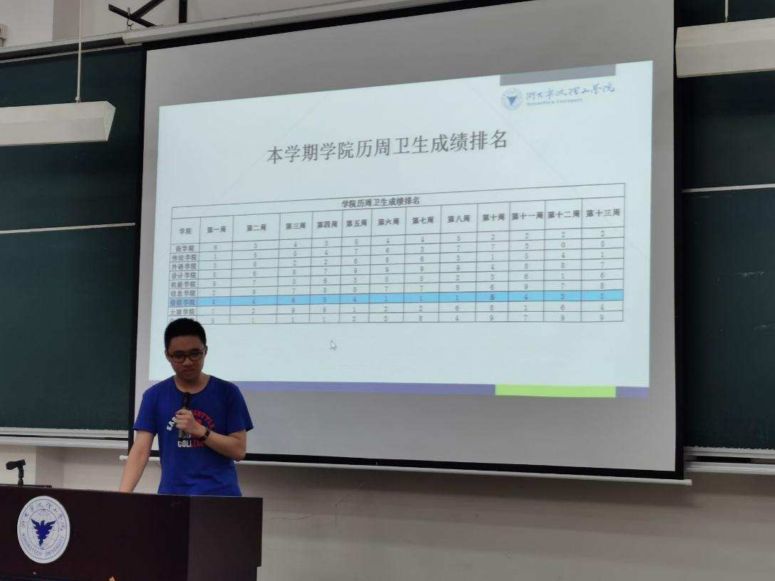 接下来,原公权部部长林卡对近期卫生情况,垃圾分类情况等进行了汇报,同时指出了还存在的一些问题例如有些班干没有及时进行班干下寝,部分同学卫生成绩个人分数低,部分寝室因为垃圾未分类被扣分等,也提出了对同学们的期望:做好寝室卫生与垃圾分类,最后对下一阶段的工作安排——寝室长考核,文明寝室评选进行了简要说明。