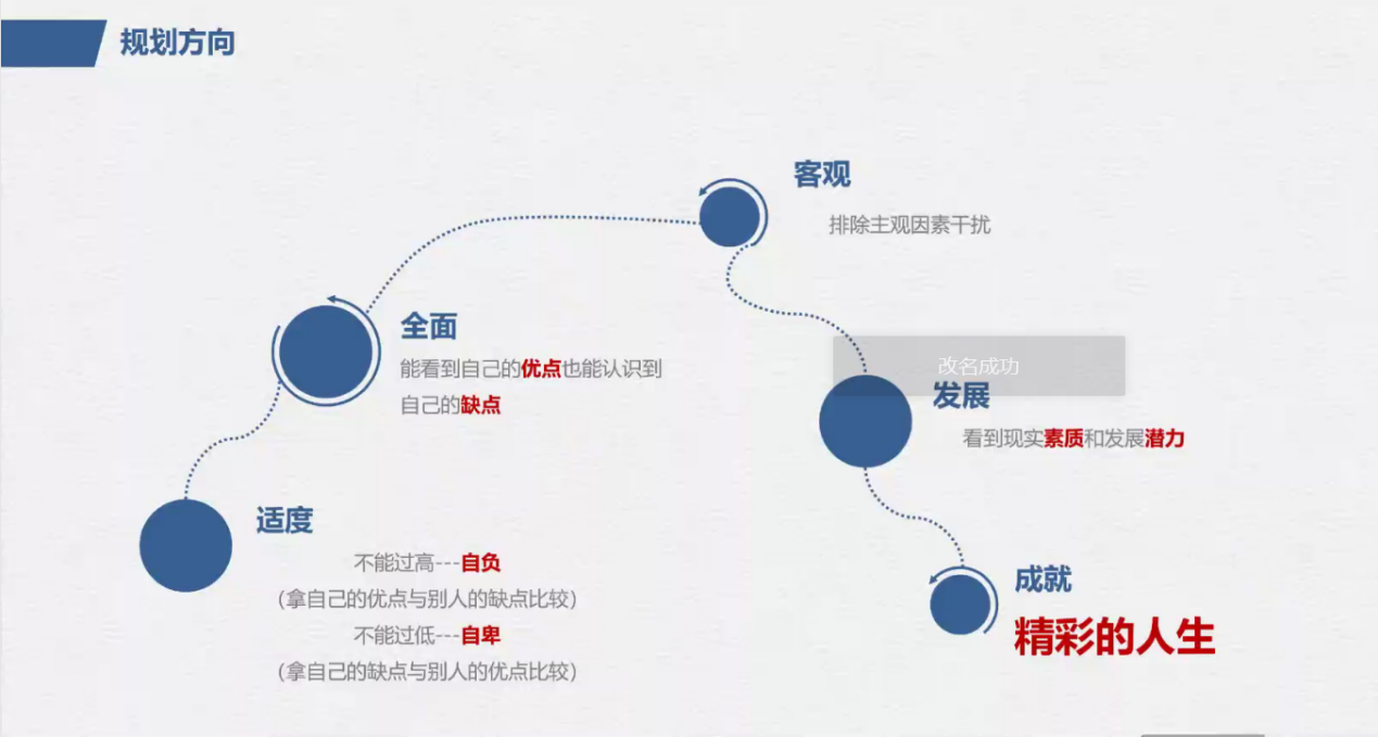 为加强我们对生涯规划重要性的认识,陈老师在第二部分着重和我们探讨了“为什么要进行人生规划”的问题。规划的意义在于不留遗憾,只有认真思考自己的未来,我们才能坚定地迈着步伐,面对理想路上的一个个挑战。人生规划并不遥远,可以从短期的小规划做起,一步一个脚印,扎扎实实地走下去,就一定会有收获。