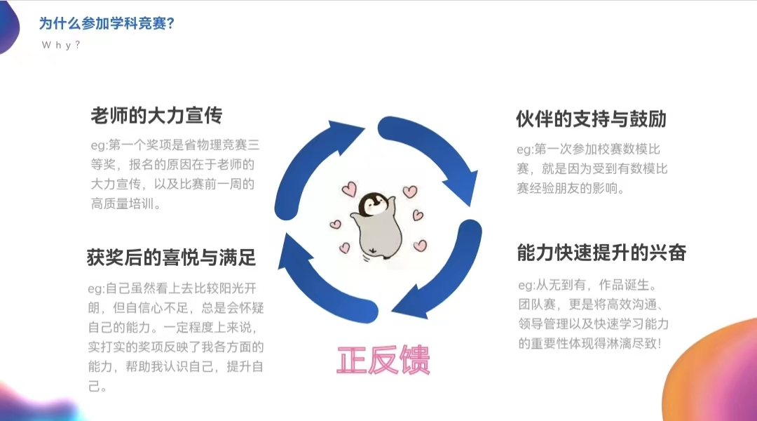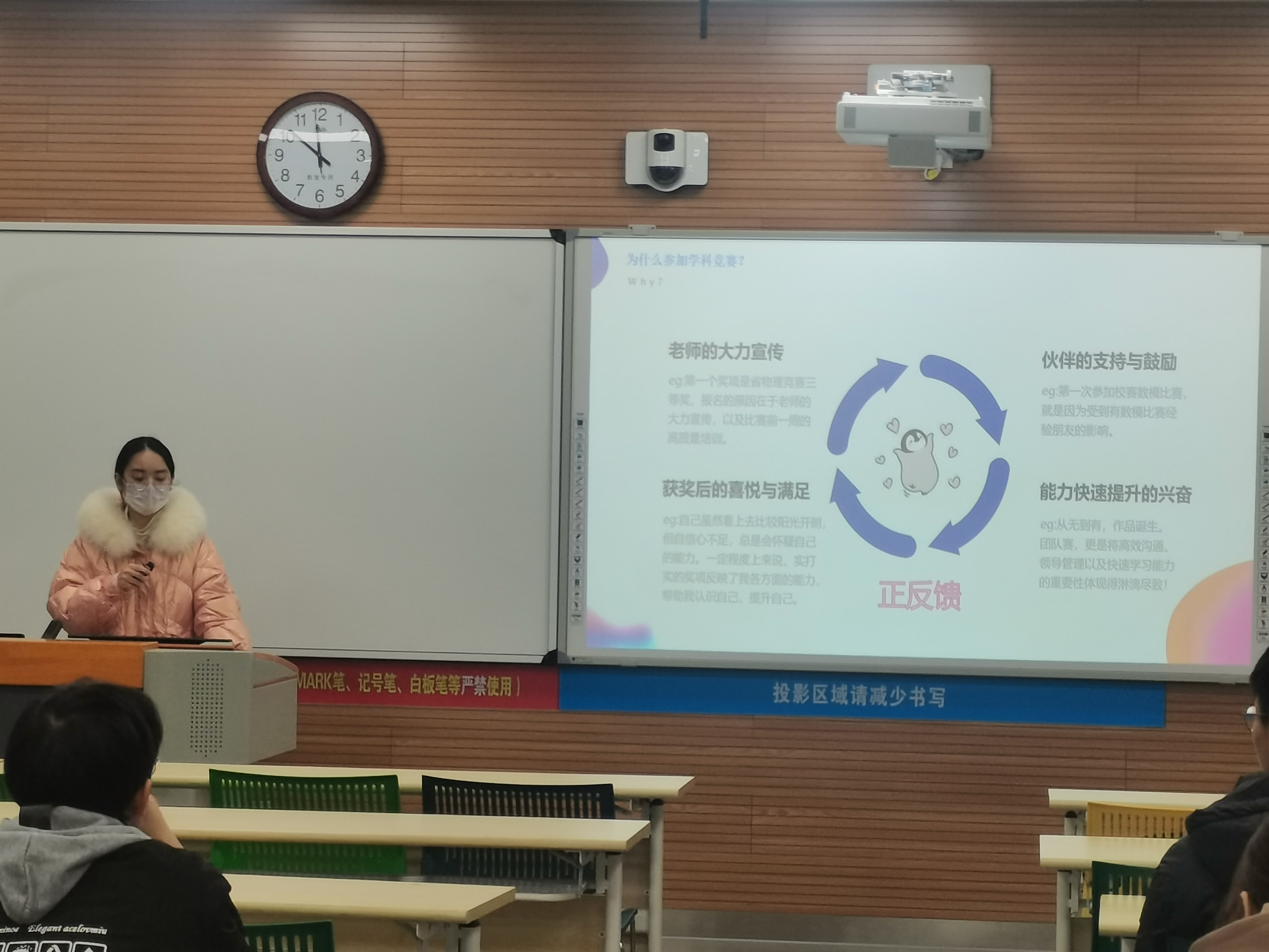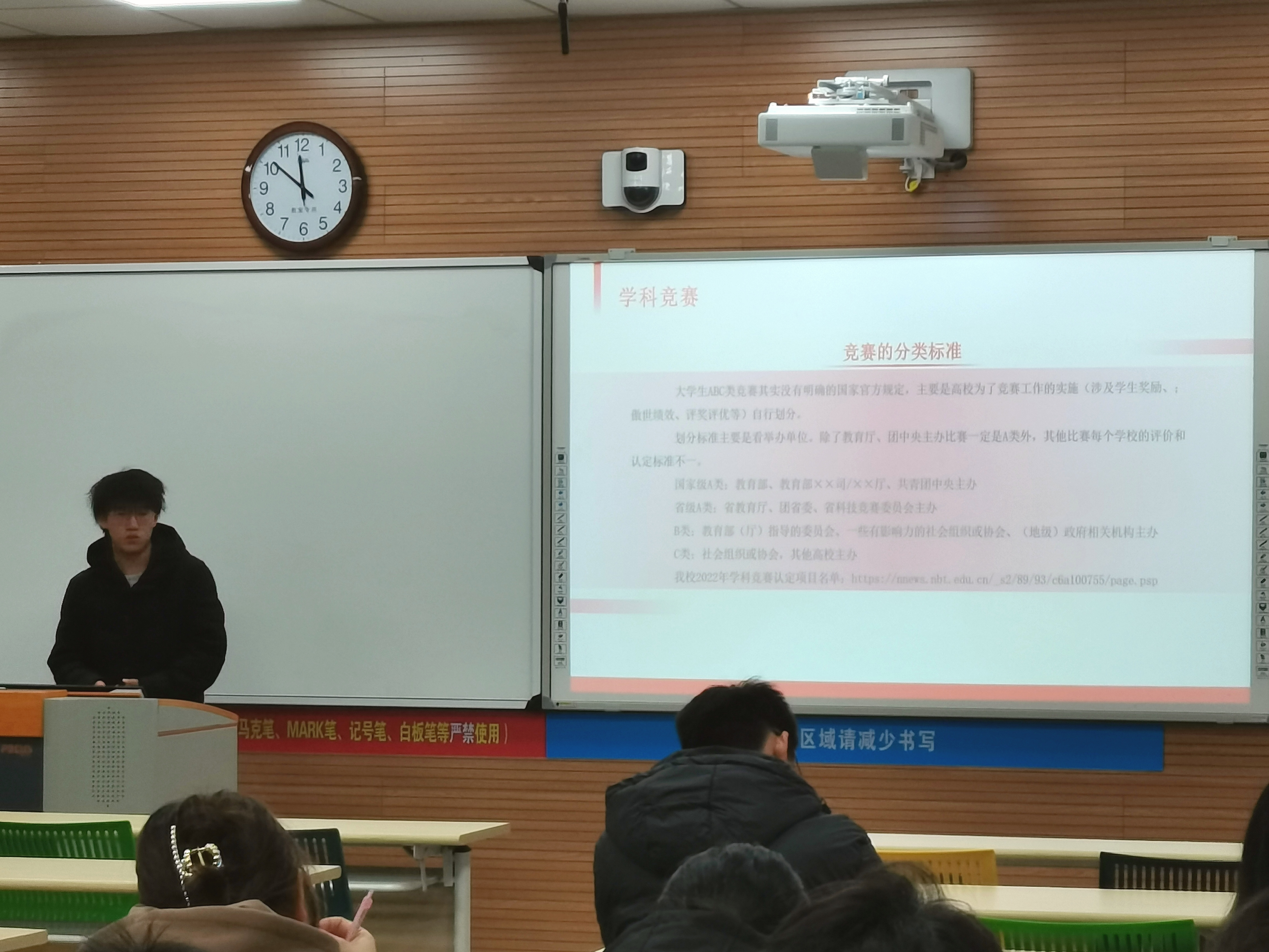 刘宸雨同学首先向大家介绍了学科竞赛的分类标准,以及有哪些竞赛、参加的途径、参加学科竞赛的意义等,之后介绍了团支书等员工工作的工作经验和方法;也介绍了社团分类、社团工作、面试技巧等,从自身经历分享了如何从社团中收获成长、提升能力。最后对老员工活提了几点建议,鼓励同学们要不负韶华,砥砺前行!
