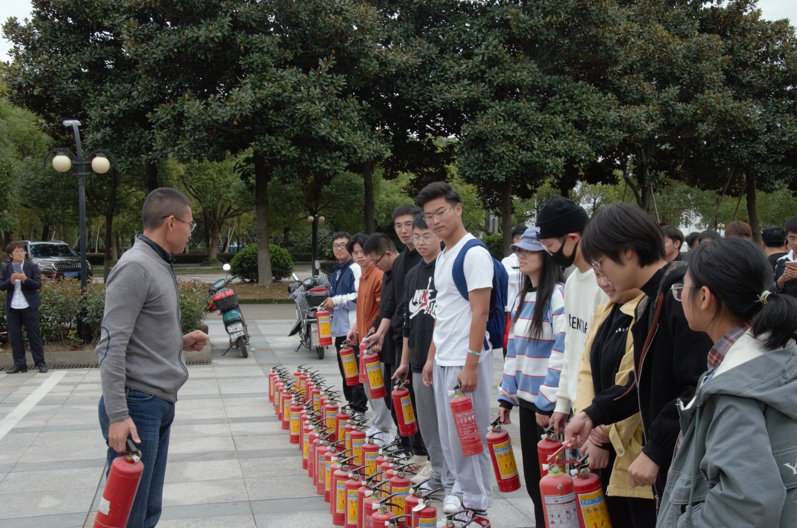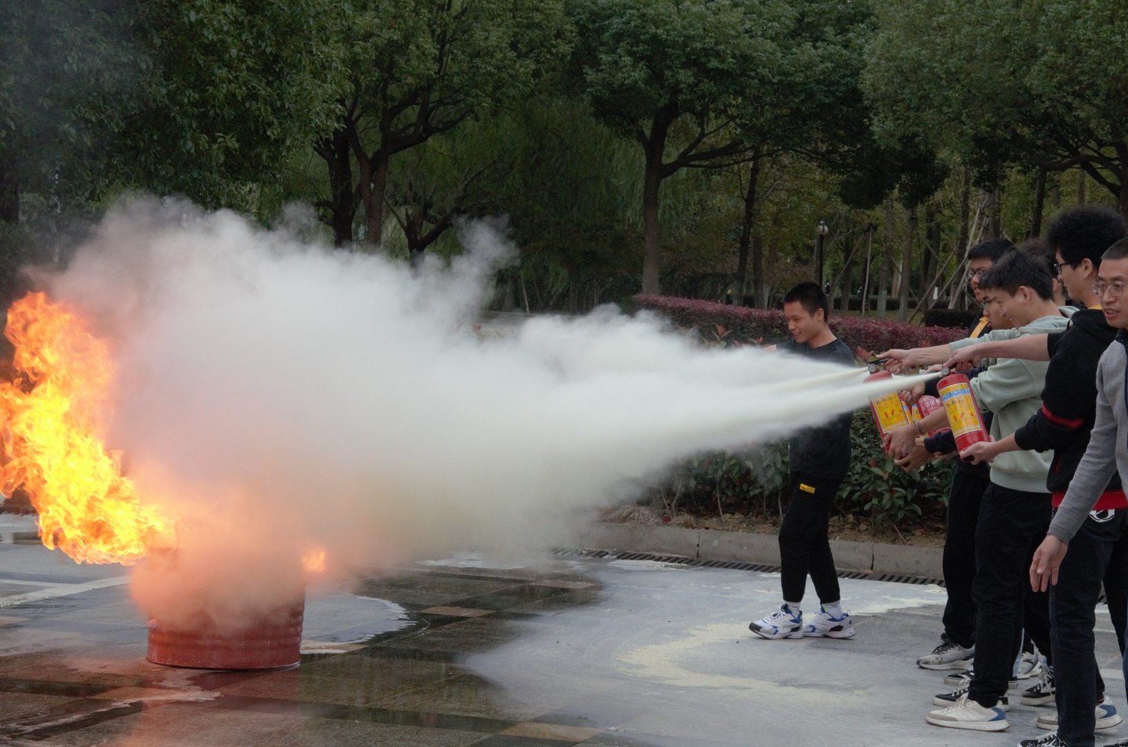 保卫处燕永波老师结合身边案例讲解了预防火灾和火场逃生的基本知识,并强调了火灾应急处理方式。为做到理论联系实践,演练还安排了灭火器实操环节,同学们热情高涨、跃跃欲试,纷纷拿起灭火器向火堆喷射泡沫,将熊熊大火扑灭。