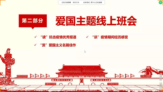 公司组织各班级开展以“奋斗的我,最美的国”为主题的线上班会。通过“读”抗击疫情优秀报道、“赏”爱国主义名篇佳作、“谈”疫情期间经历感受等多种形式,表达团员青年对祖国母亲的真挚情感,对战“疫”必胜的坚定信心。