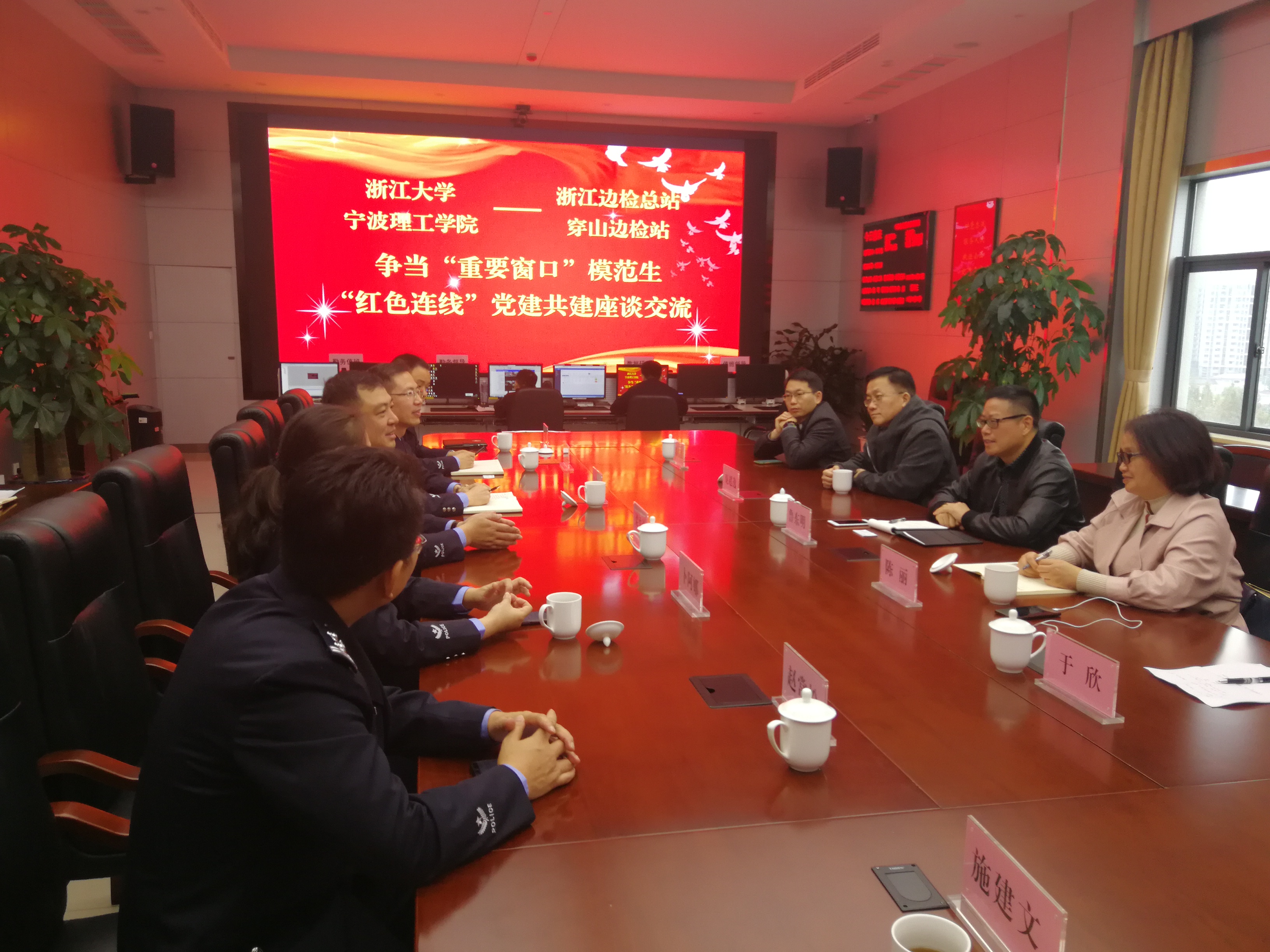 在浙江边检总站宁波穿山边检站林华志站长的陪同下,鲁东明一行参观了宁波穿山港区码头、宁波穿山边检站等地。随后,与穿山边检站开展争当“重要窗口”模范生,“红色连线”党建共建座谈交流会。会上,双方各自介绍了基本情况,然后就科研合作、产教融合、党建共建等工作进行深入交流,并达成进一步合作意向。