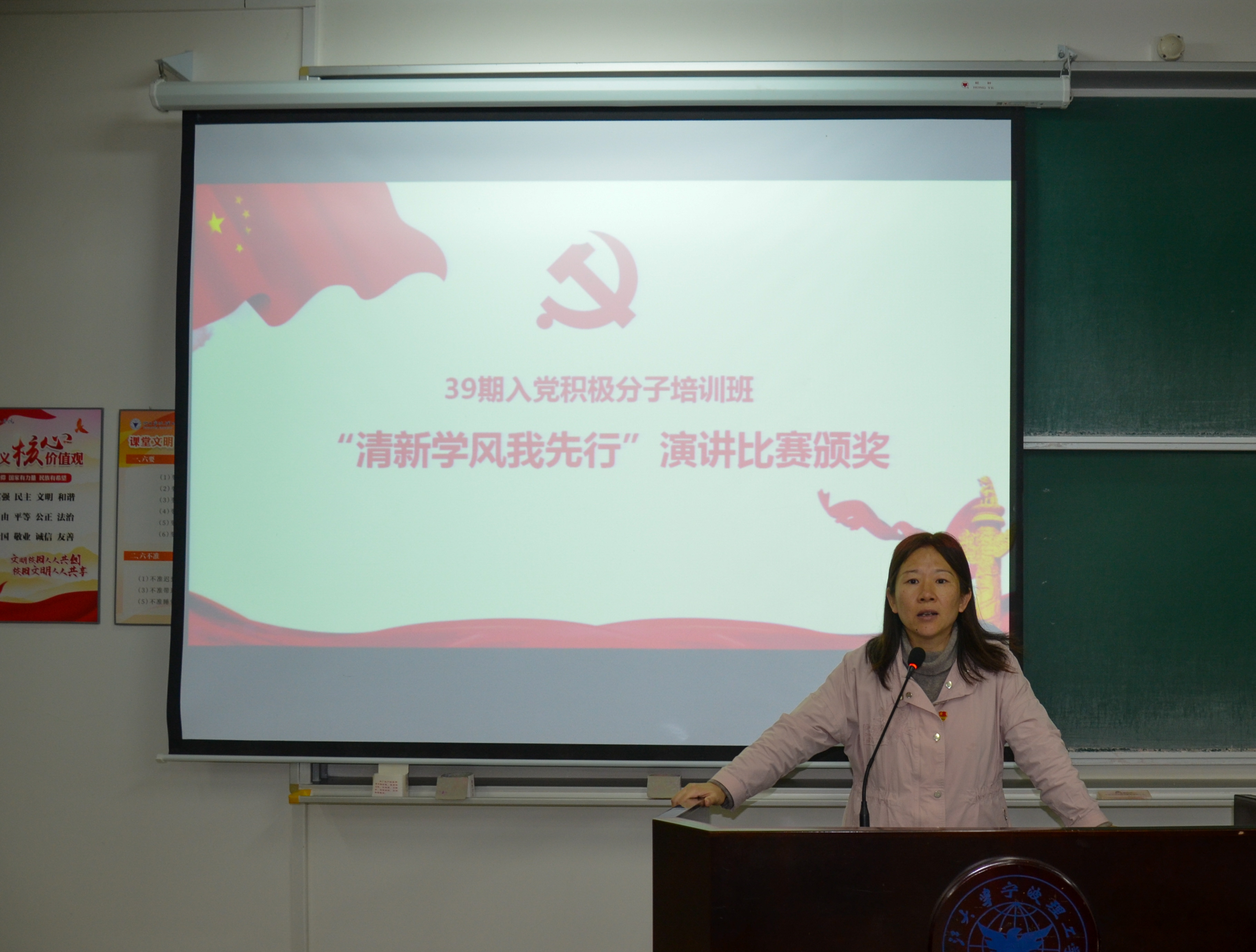 11月26日下午,​公司党校第39期入党积极分子培训教学班结业典礼在NB230教室隆重举行。参加此次典礼的有公司党委副书记、纪委书记汪洪老师,公司党委组织委员、思政主管、计算机员工党支部书记王常青老师,数据员工党支部书记马炜栋老师,公司党委党务助理汪炼晋和教学班全体成员。典礼由马炜栋老师主持。