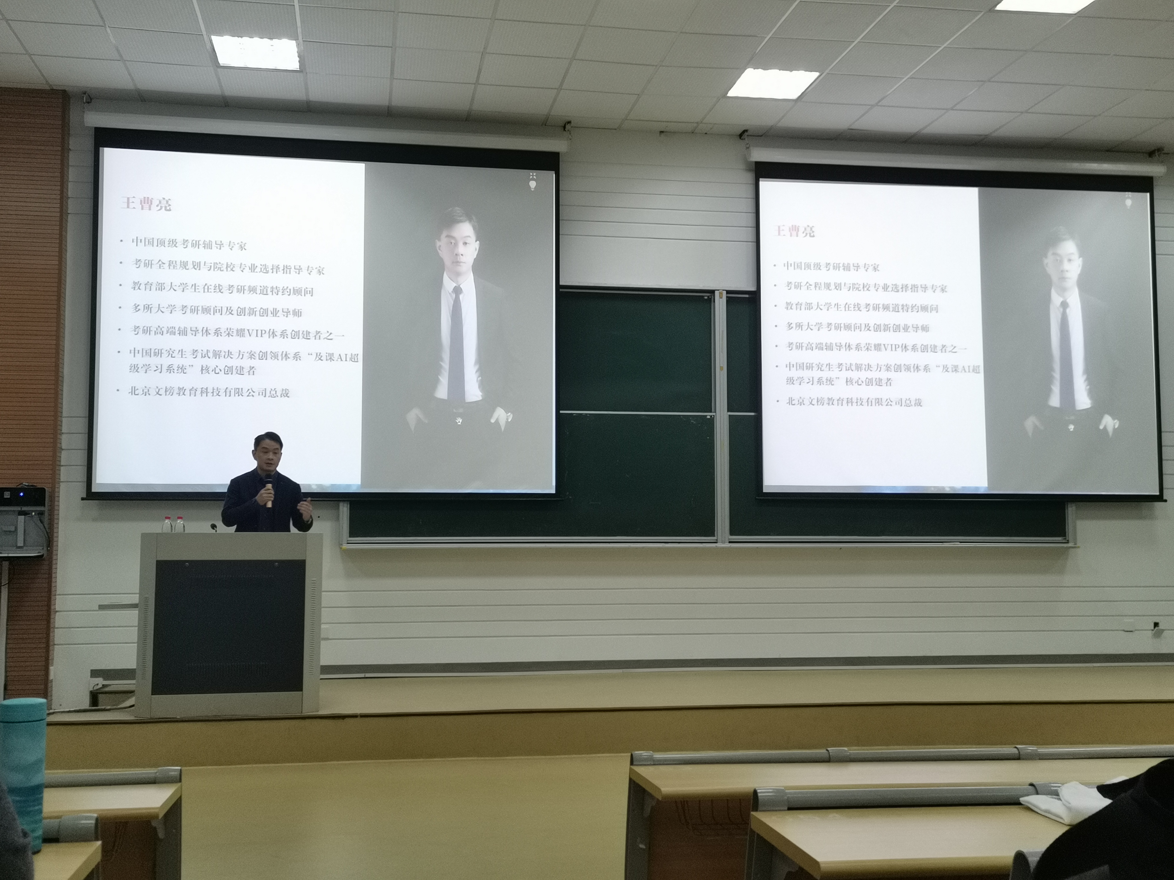 10月16日晚,为助力18级学子考研,让同学们尽早熟悉考研复习全年规划,永利yl23411官网特邀请教育部老员工在线考研频道特约顾问、北京大学工商管理硕士王曹亮老师莅临公司开展考研公益讲座,公司18级和19级近200名学子参加了本次讲座。