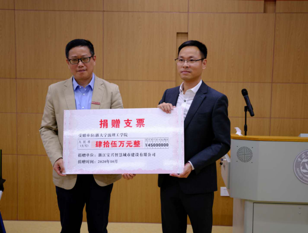 在全场嘉宾、师生代表们的见证下,校教育发展基金会秘书长陈美芳与浙江宝兴智慧城市建设有限公司副总经理周浩签署协议书,校教育发展基金会理事长鲁东明接受宝兴智慧公司45万元的捐赠支票,标志着 “宝兴智慧奖学金”正式成立。