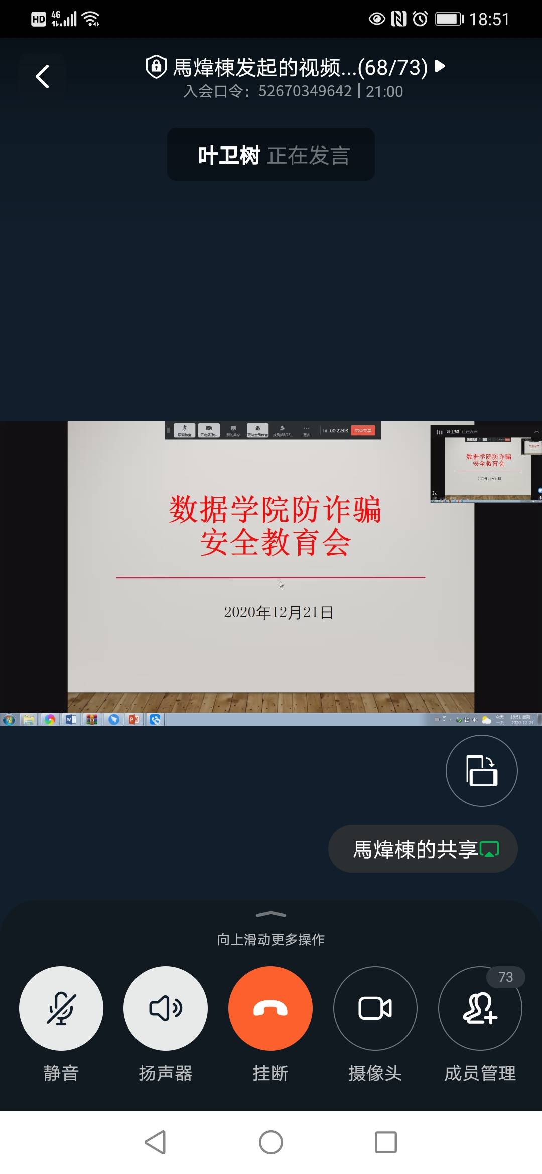 叶卫树老师介绍近期校园诈骗案件的发生情况,就常见诈骗种类做了补充说明,还对冬季寝室的消防隐患和用电安全进行了强调。