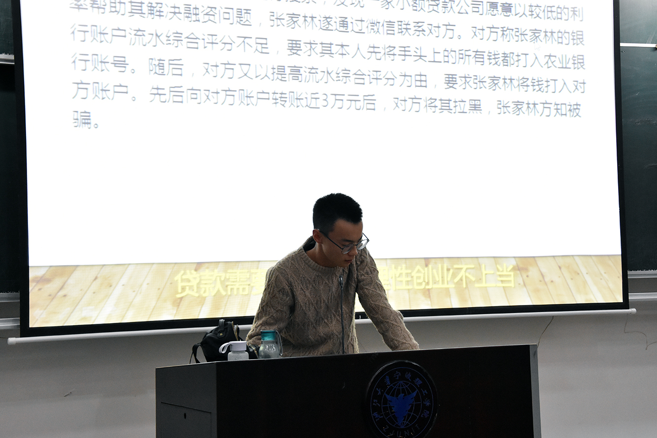 大会第二环节由反诈骗志愿者顾佳乐同学作防诈骗主题宣讲,他列举了近段时间以来老员工受到诈骗的真实案例,并提醒同学们应当重视此类问题,进一步提高防范意识。