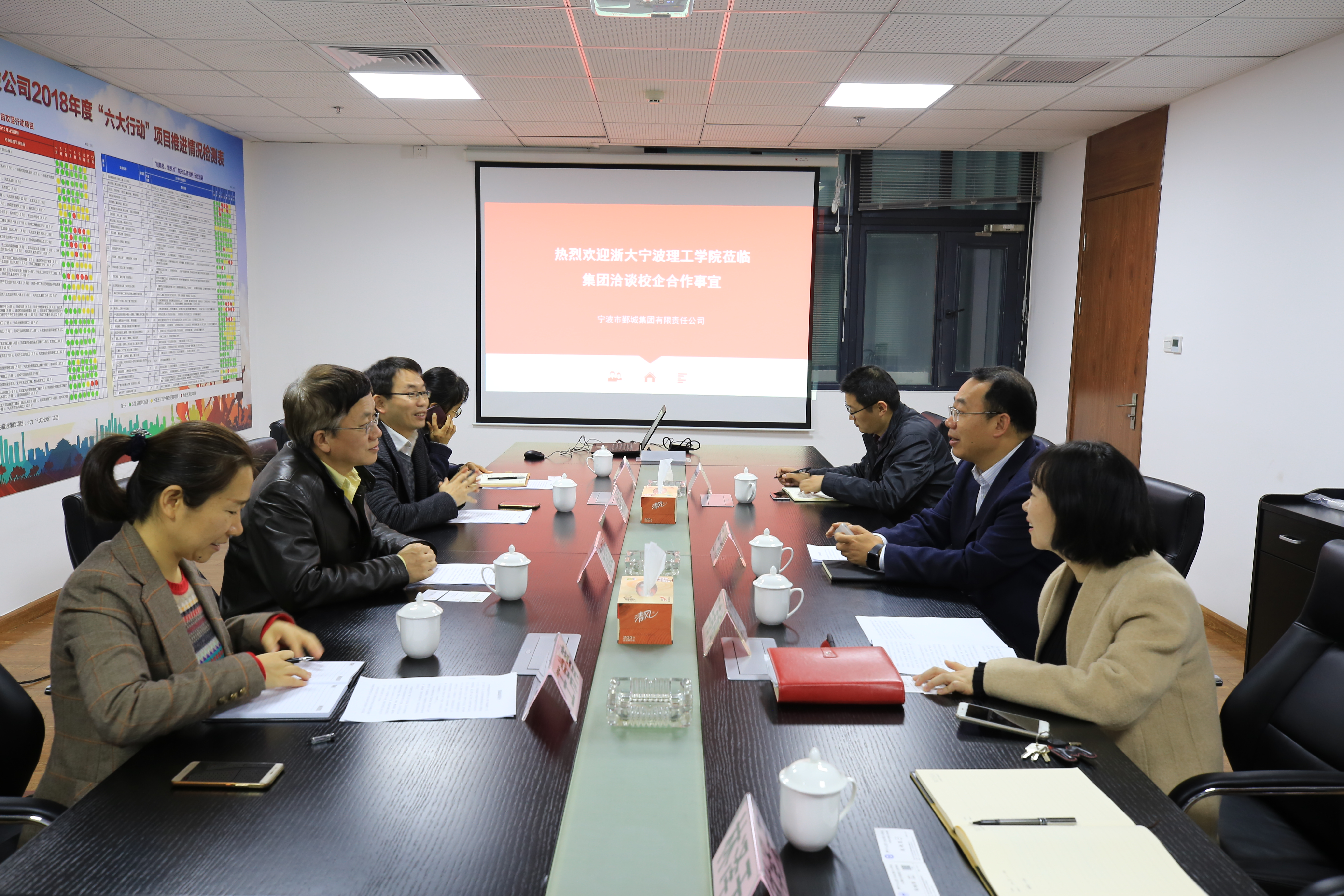 2018年11月28日上午,公司经理庞超逸教授、副经理陈根浪副教授一行来到鄞城集团洽谈合作,鄞城集团董事长王翔、副总经理马春梅及负责校企合作的相关人员参加了合作交流会。