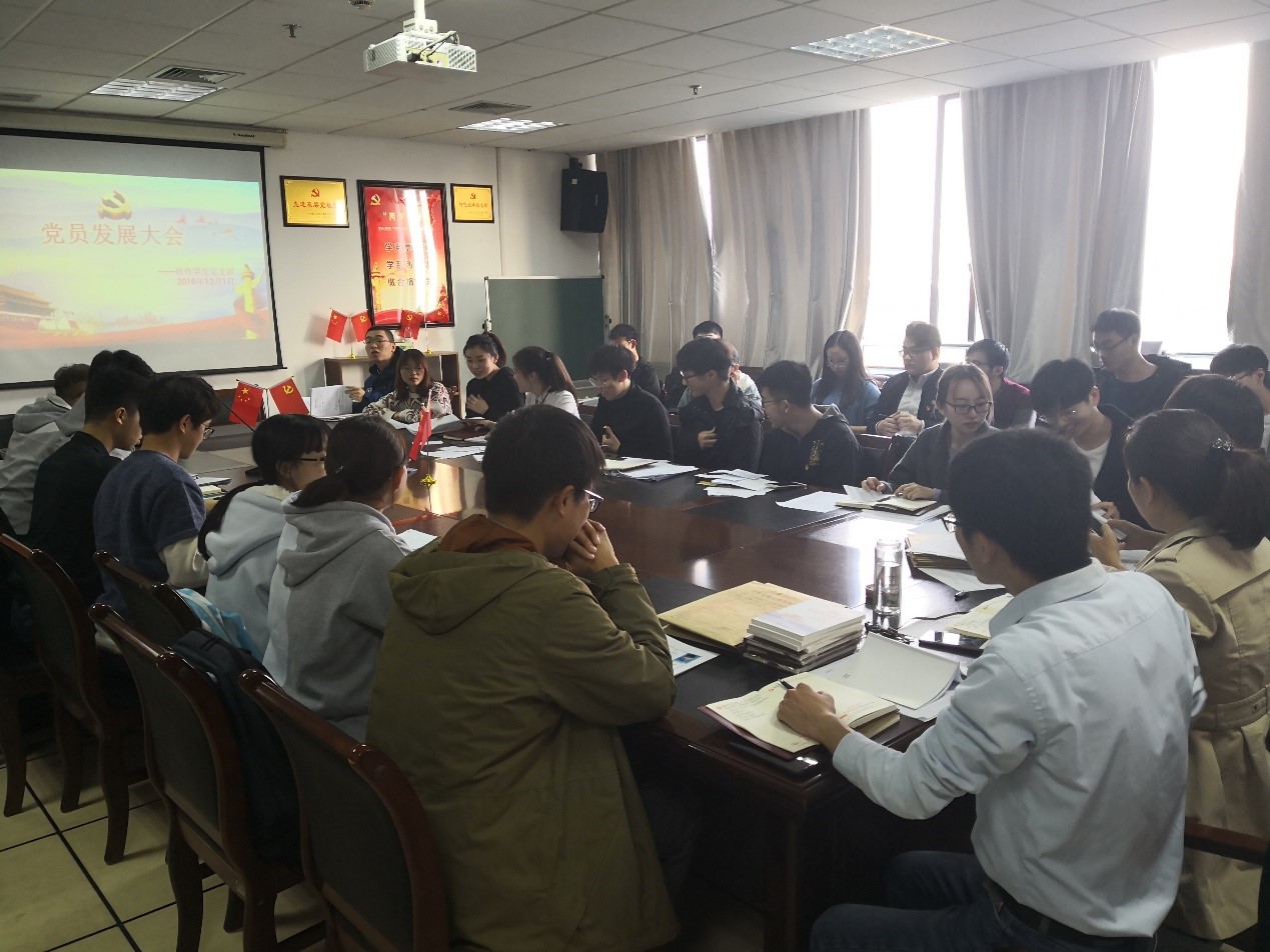 大会开始,由发展对象进行入党志愿书的宣读,表达对党的向往,对党的忠诚,坚定不移跟党走,为共产主义事业奋斗终生。入党介绍人依次介绍了发展对象的基本信息,对其能否入党表明意见。组织委员报告了对发展对象的审查情况。到会党员对发展对象的情况进行了充分讨论,并进行了无记名投票。之后,表决通过了接收徐梁彬等6名同学为预备党员的决议。在接下去的预备党员转正会上,又表决通过了确定张森涵等4名同学为正式党员的决议。王老师对新一批的发展对象和转正党员提出寄语,希望他们为同学服务,做员工表率,加强自身修养。