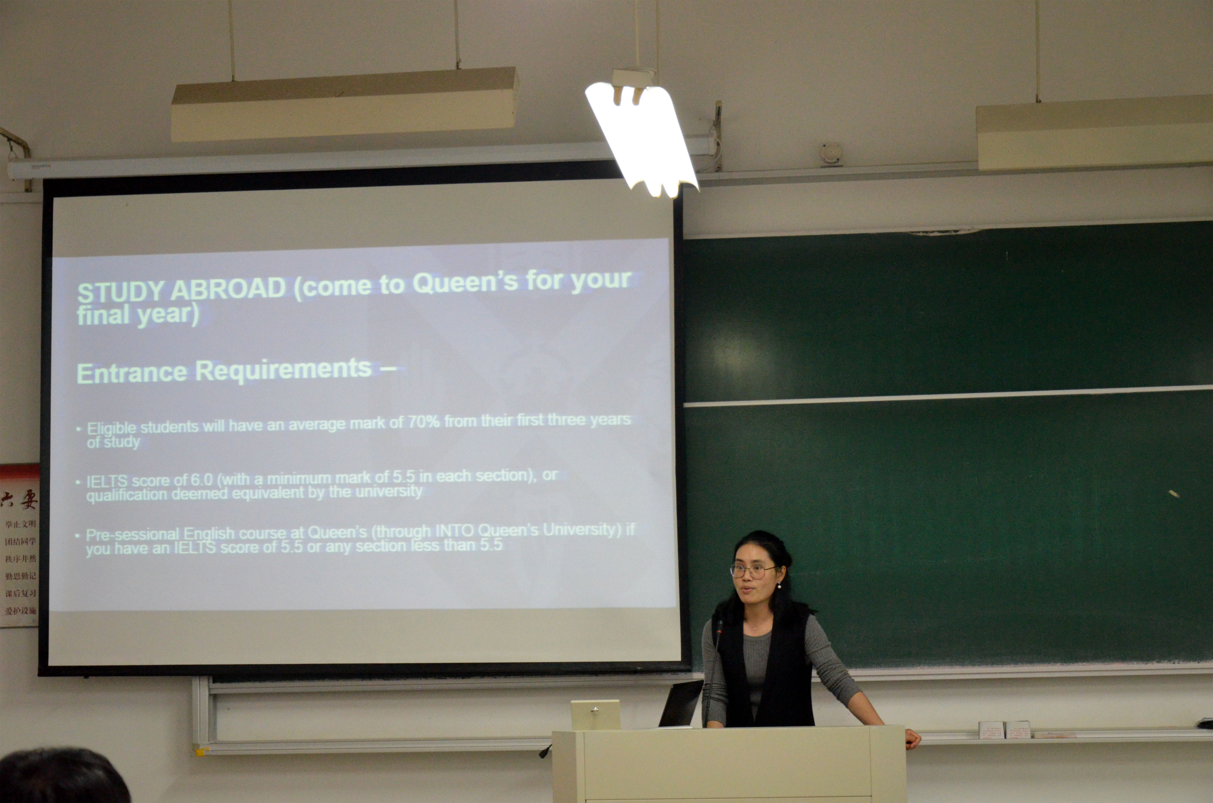 本次宣讲会的开展主要针对具有出国留学意向的同学,会上Huiyuzhou老师详细地为在场师生讲解了留学的主要目的以及未来发展方向,并为大家介绍了进入女王大学留学的基本要求以及在校期间所要学习的课程。演讲期间,师生互动频繁,同学们的疑问得到了充分的解决,
