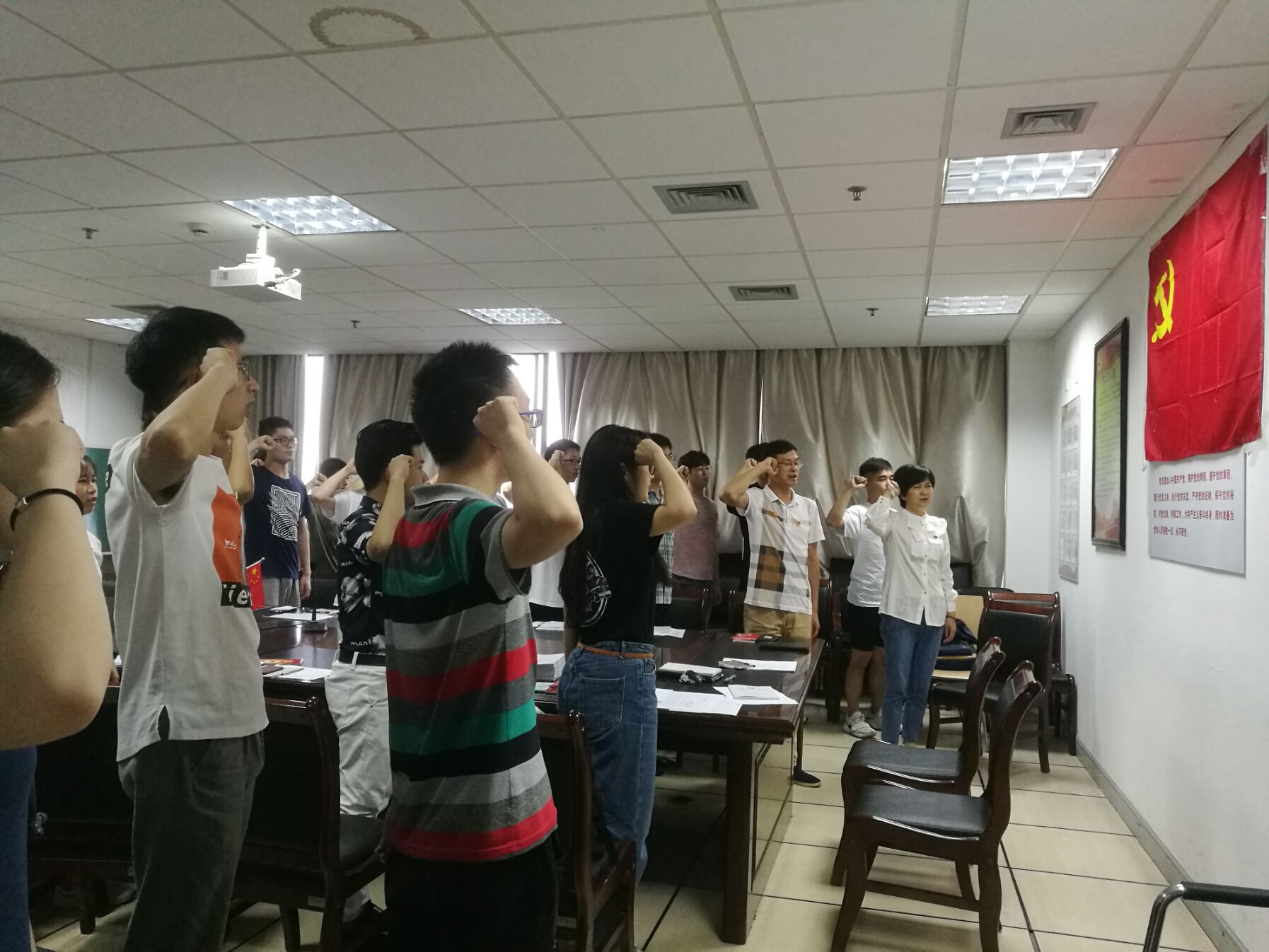 大会开始,由王常青老师介绍大会到场老师和参会人员。随后,全体起立,奏唱《国歌》。接下来举行了入党宣誓仪式,由邬旭东老师领誓,全体新发展党员面向党旗宣誓,到会的其他党员重温入党誓词。新发展党员代表信计161班张智涵发言,她表示,在今后的学习、工作和生活中,会不断加强党的知识的学习,努力提高业务水平,提高为人民服务的本领,认真履行党员义务,成为一名合格的共产党员。