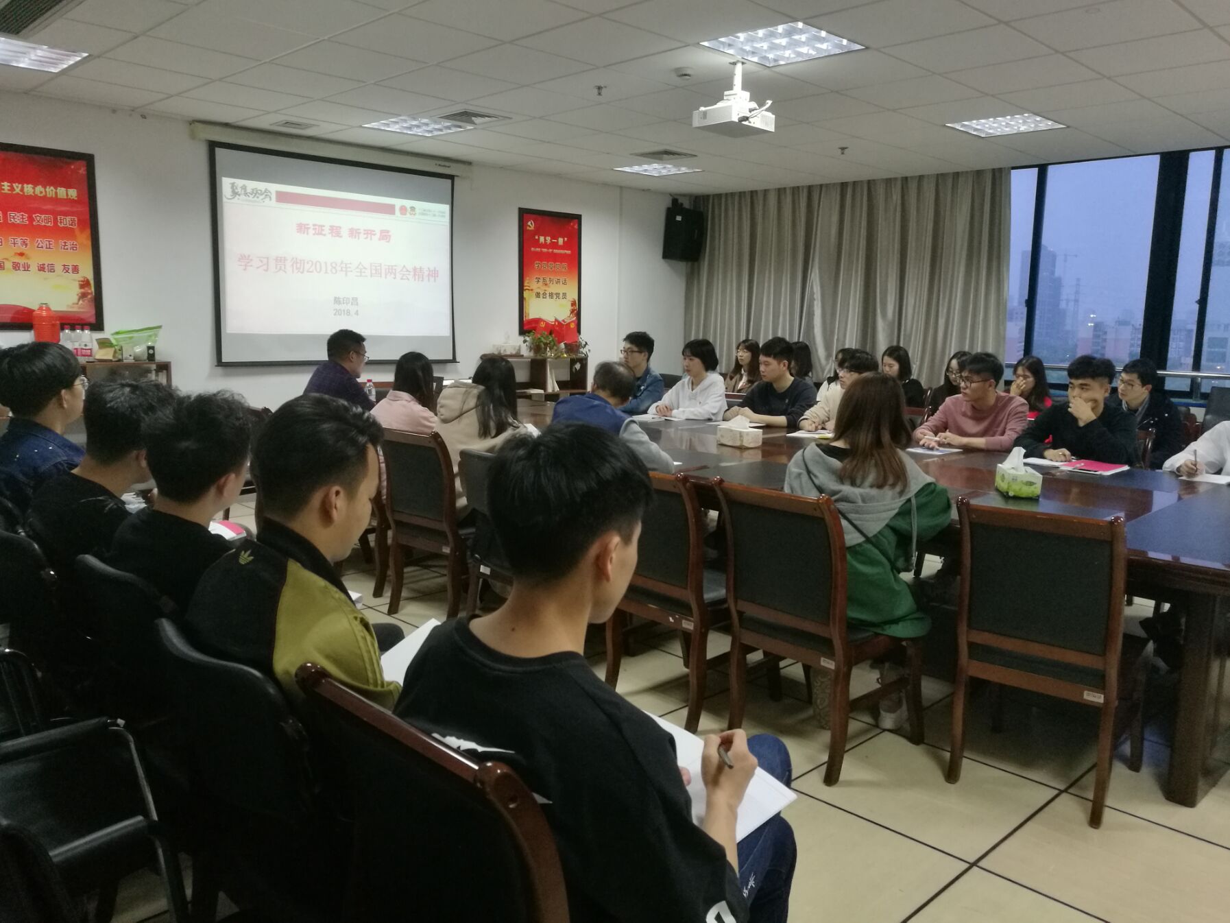 4月12日18:00,​公司党总支在石麟大楼602党员之家举行了学习贯彻2018年全国两会精神专题辅导讲座讲座由公司思政主管王常青主持,传媒公司陈印昌老师主讲,全体员工预备党员参加
