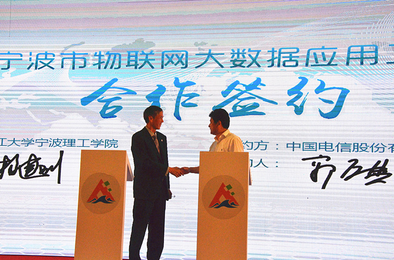 公司杨建刚副经理代表公司和中国电信股份有限公司宁波分公司总经理郭百其就共建宁波市物联网大数据应用工程中心进行合作签约,合作内容包括大数据领域高端企业人才培训、智能制造和大数据项目合作、NB-IoT窄带物联网应用技术研究、人才培养和实验室共建等。
