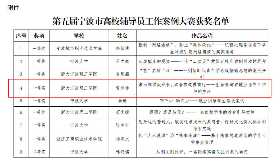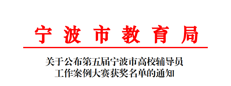 近日,第五届宁波市高校辅导员工作案例大赛传来捷报,公司选送的6个作品全部获奖,在数量与质量上皆获历史突破。其中,一等奖在全市8项中占3项,位列全市高校并列第一,另获二等奖2项,三等奖1项。