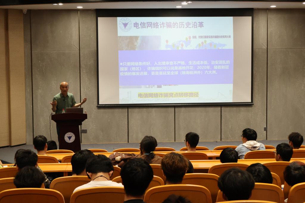 结合电信网络诈骗治理,叶卫树展示近年来高校反诈工作取得的成果。他强调,预防电信网络诈骗需要社会各界的广泛重视,只有人人宣传反诈、人人参与反诈,才能不断夯实反诈工作的基石。他提醒同学们要提高警惕、端正动机、洁身自好,不点陌生链接,不随意转账,不给不法分子可乘之机。