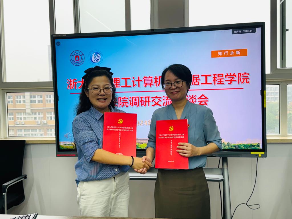 双方先开展了座谈交流。宁波大学信息科学与工程公司党委书记王伦耀介绍了公司建设情况,并重点展示了全国党建工作标杆院系的创建工作成果。党委副书记李洁介绍了员工创新创业工作情况。公司党委书记于欣介绍了公司发展历程、人才培养、党建工作等情况。随后双方就全国标杆院系建设、公司产品、人才培养、员工学科竞赛管理、双创、就业等相关工作进行了深入交流。会议最后,两院行政教工党支部进行了党建联建结对仪式,双方支部将秉承立德树人的教育初心,加强学习交流,提升管理服务师生水平。