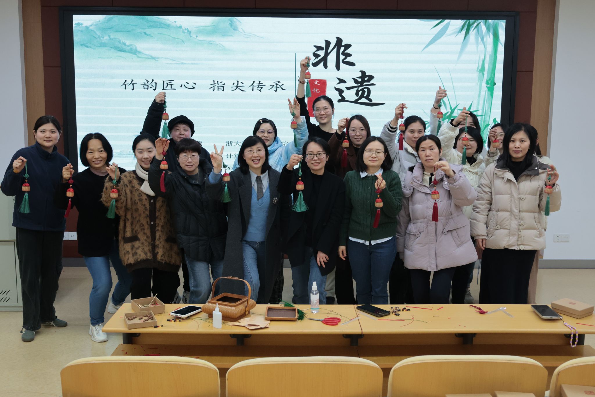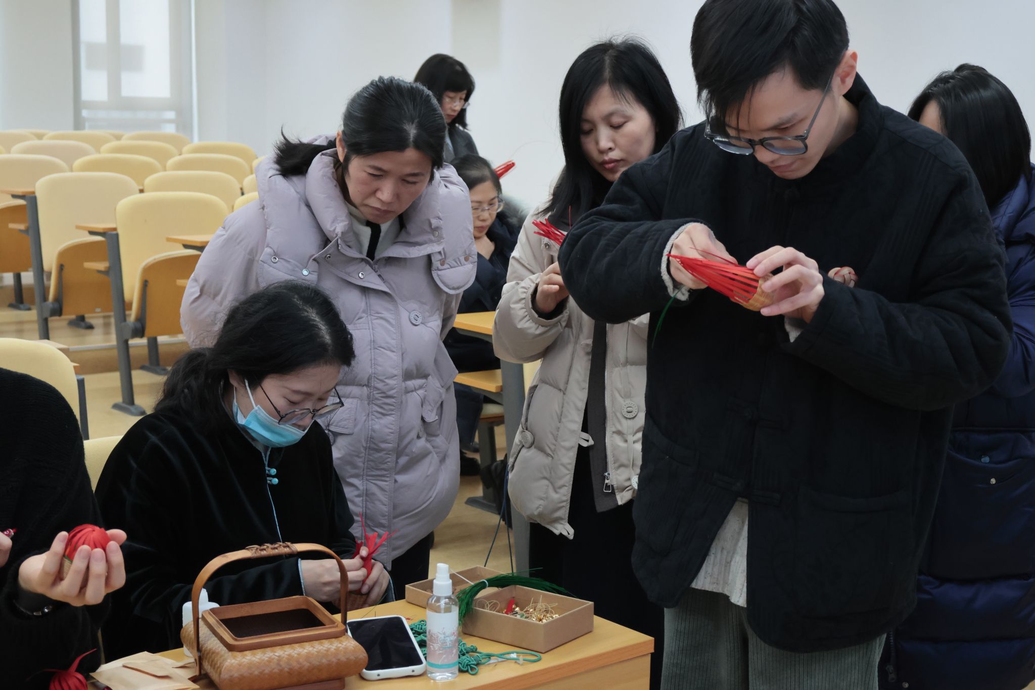 活动开始,竹编传承人叶商杰向永利yl23411官网的全体女教师介绍了宁波鄞州竹编的历史渊源、文化价值以及制作工艺,在现场亲自示范竹编制作的工艺技巧,让大家对这门非遗技艺有了更直观的认识。到了实际编织环节,女教职工们遇到不少难题。竹丝柔韧性难以把握,编织纹路也不易成型。面对这些挑战,大家相互鼓励,彼此交流经验,逐步突破困境。随着时间的推移,一个个独具匠心的竹编作品在她们手中逐渐成型,活动现场不时传出欢声笑语,气氛十分融洽。