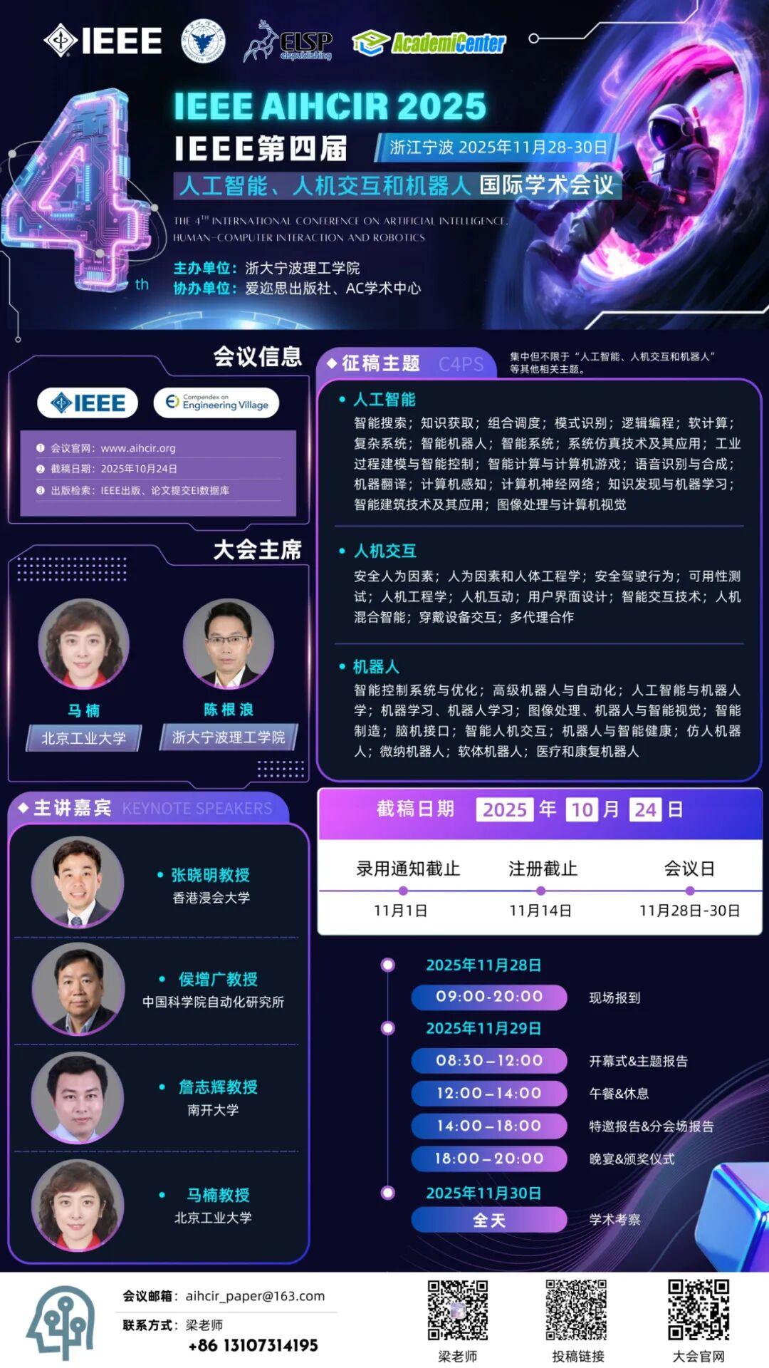 2025年IEEE第四届人工智能、人机交互和机器人国际学术会议 (IEEE AIHCIR 2025)将于2025年11月28-30日在浙江宁波盛大举行。